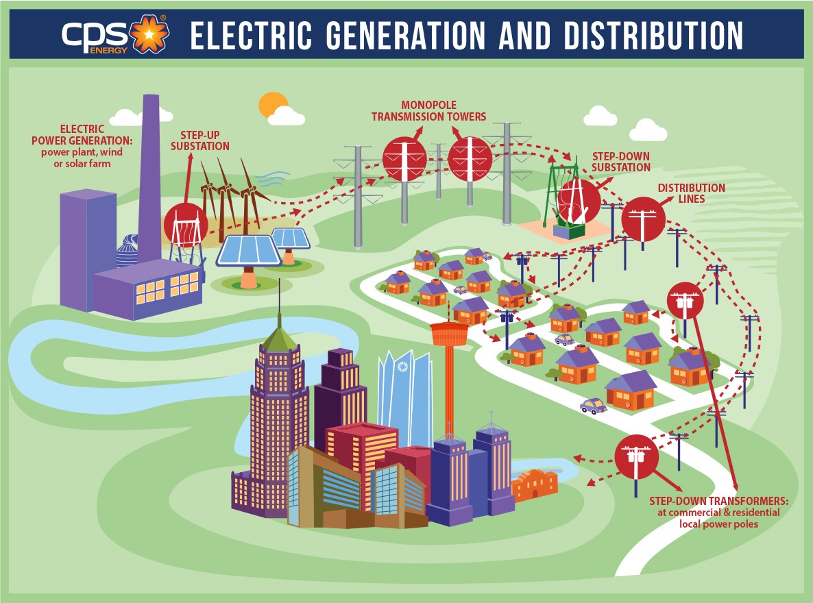- Transmission lines carry this ramped-up electricity to distribution substations. Banks of transformers step down the electricity's voltage, so it can travel through smaller distribution lines to residential and commercial districts throughout the service area.